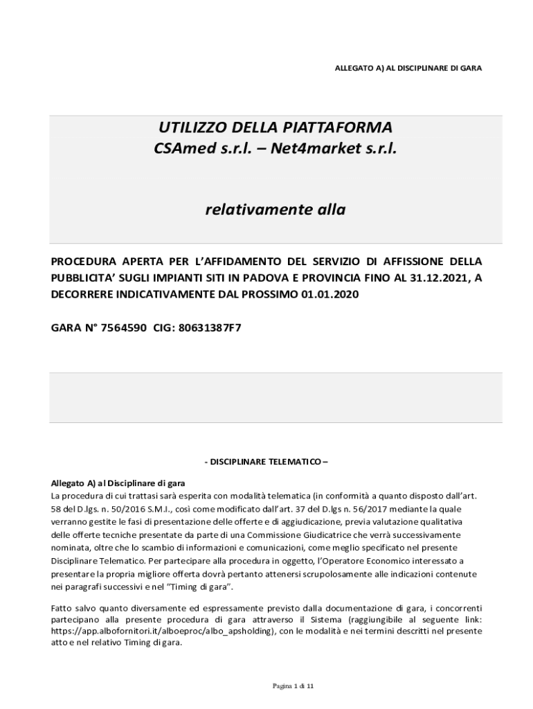 ALLEGATION A) AL DISCIPLINARY DI GARAUTILIZZO DELLA PIATTAFORMA CSA med s.r.l. Net4market s.r.l. relativamente alley PROCEDURE APE RTA PER LAFFIDAMENTO DEL SERVILLO DI ADMISSION DELLA PUBLICITY SUGAR