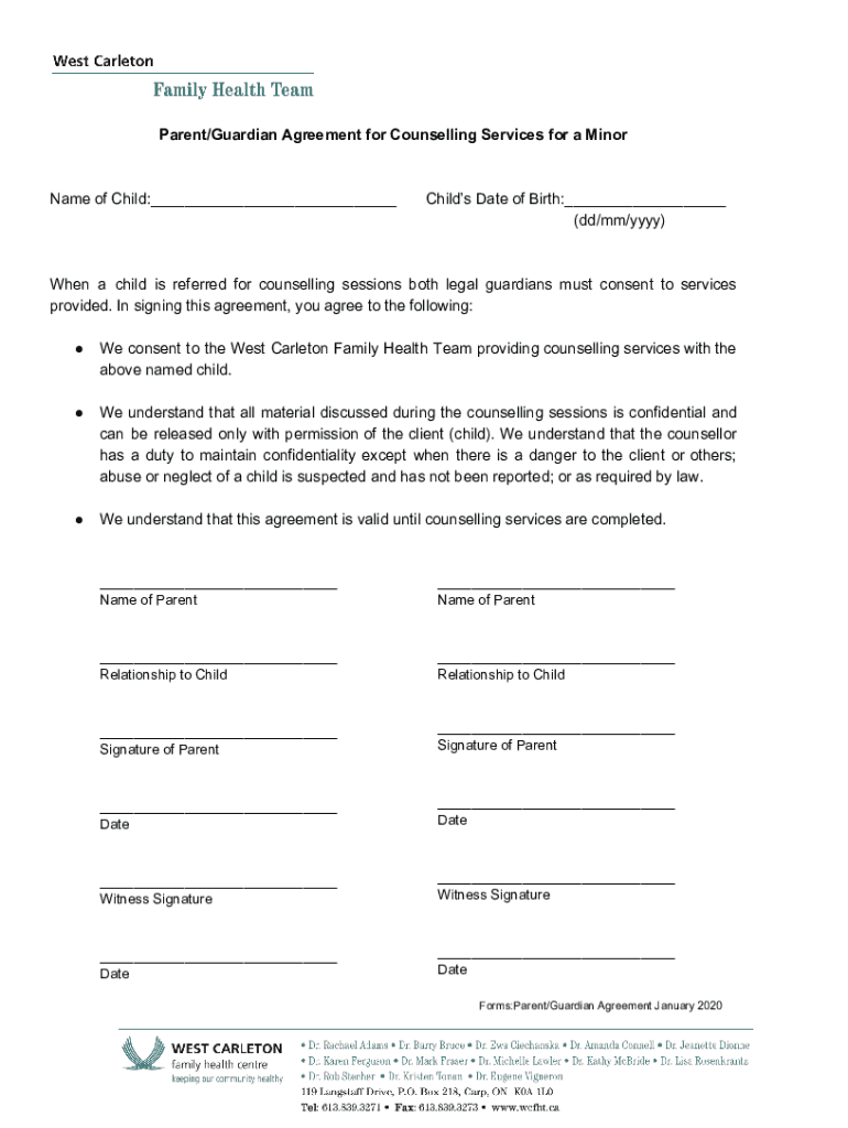 Parent/Guardian Agreement for Counselling Services for a Mainframe of Child:___Child's Date of Birth:___ (dd/mm/YYY)When a child is referred for counselling sessions both legal guardians must consent