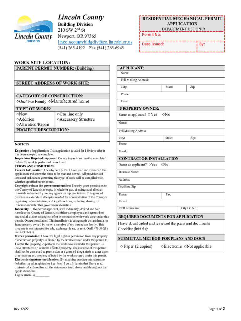 Lincoln Outbuilding Division 210 SW 2nd St Newport, OR 97365 lincolncountybldgdiv@co.lincoln.or.us(541) 2654192 Fax (541) 2656945WORK SITE LOCATION:PARENT PERMIT NUMBER: (Building) STREET ADDRESS