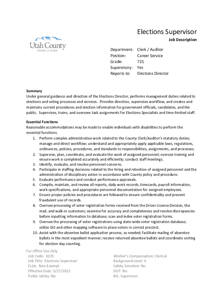 Elections Supervisor Job DescriptionDepartment: Position: Grade: Supervisory: Reports to:Clerk / Auditor Career Service 721 Yes Elections DirectorSummary Under general guidance and direction of the