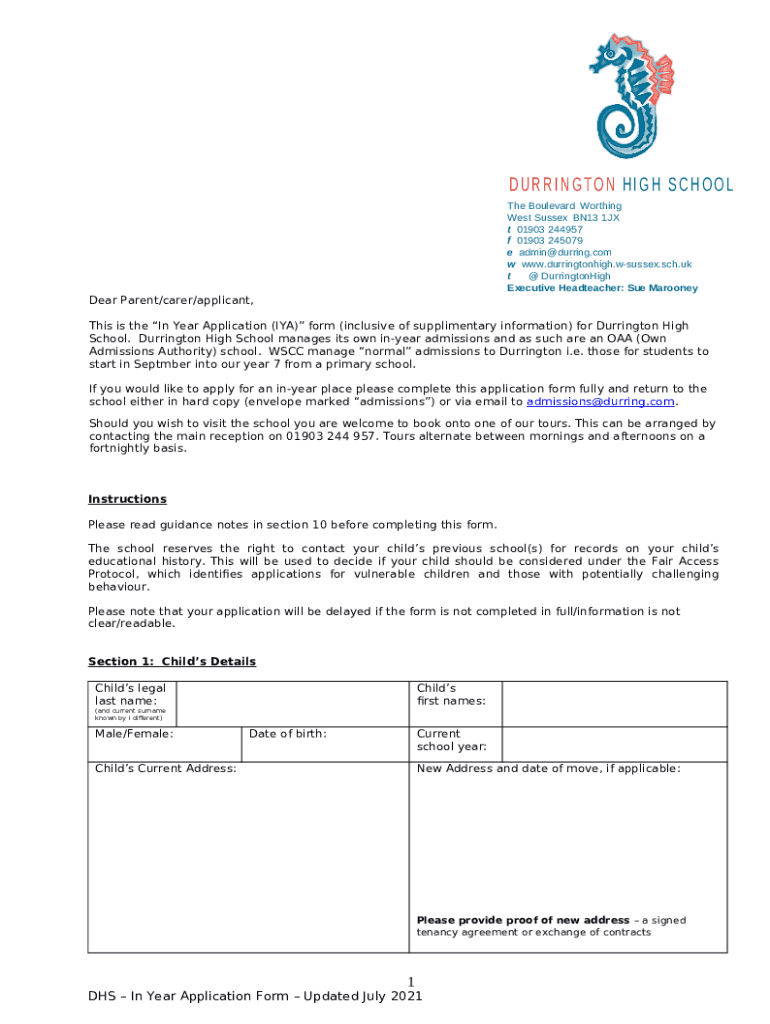 Instructions for the form Durrington High School: durringtonhigh.w-sussex.sch.uk