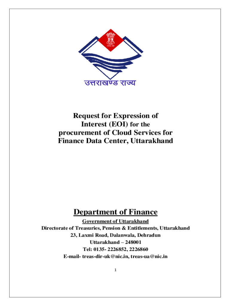 Request for Expression of Interest (EOI) for the procurement of Cloud Services for Finance Data Center, UttarakhandDepartment of Finance Government of Uttarakhand Directorate of Treasuries, Pension