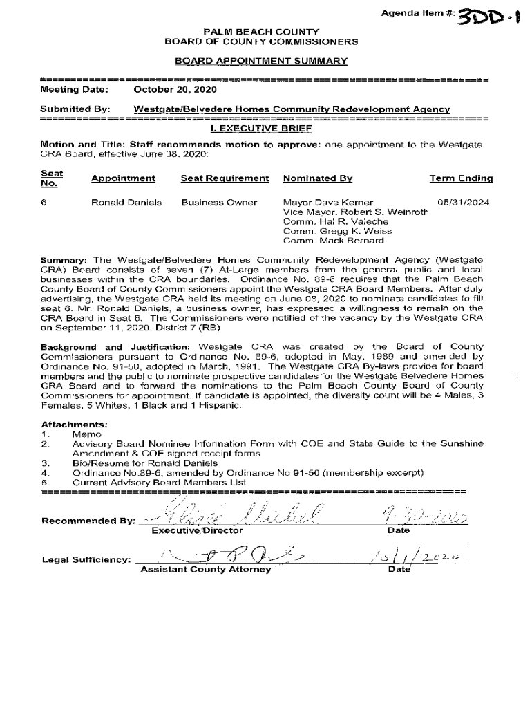 Agenda Item #:3Dl) PALM BEACH COUNTY BOARD OF COUNTY COMMISSIONERS BOARD APPOINTMENT SUMMARY Meeting Date:October 20, 2020Submitted By:West gate/Belvedere Homes Community Redevelopment Ag. Ency I.