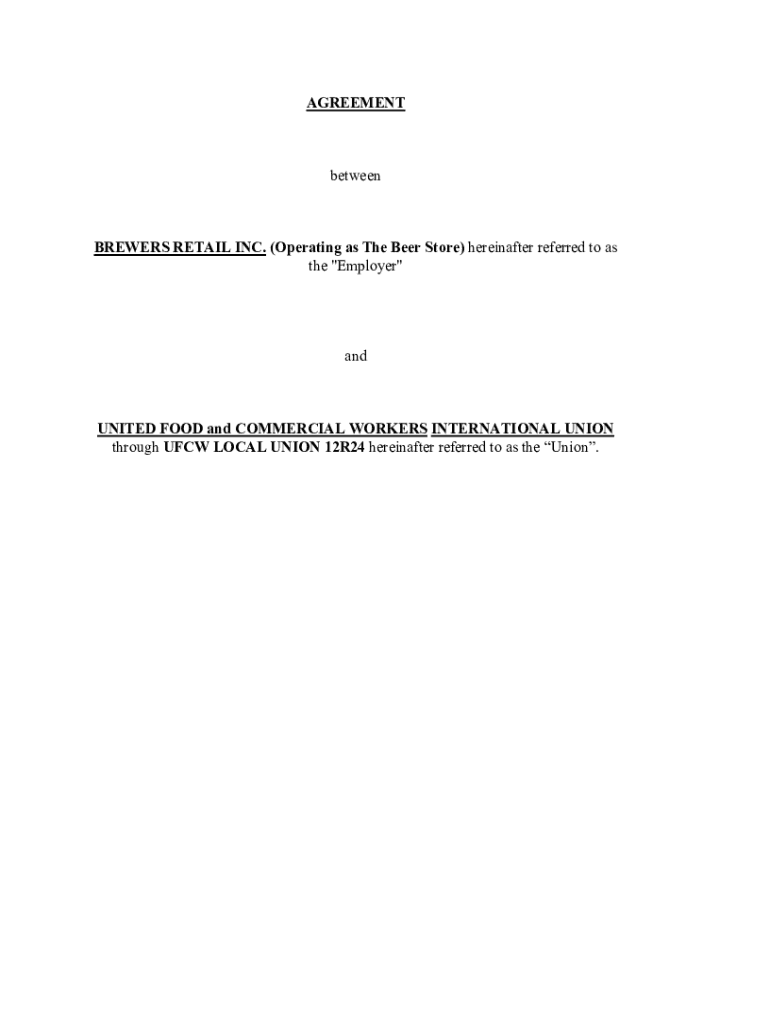 AGREEMENTbetweenBREWERS RETAIL INC. (Operating as The Beer Store) hereinafter referred to as the \” Employer\” inducted FOOD and COMMERCIAL WORKERS INTERNATIONAL UNION through FCW LOCAL UNION