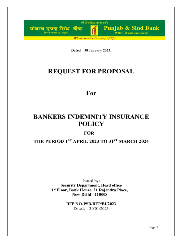 Dated30 January 2023.REQUEST FOR PROPOSAL Bankers INDEMNITY INSURANCE POLICY FOR THE PERIOD 1ST APRIL 2023 TO 31ST MARCH 2024Issued by: Security Department, Head office st 1 Floor, Bank House, 21