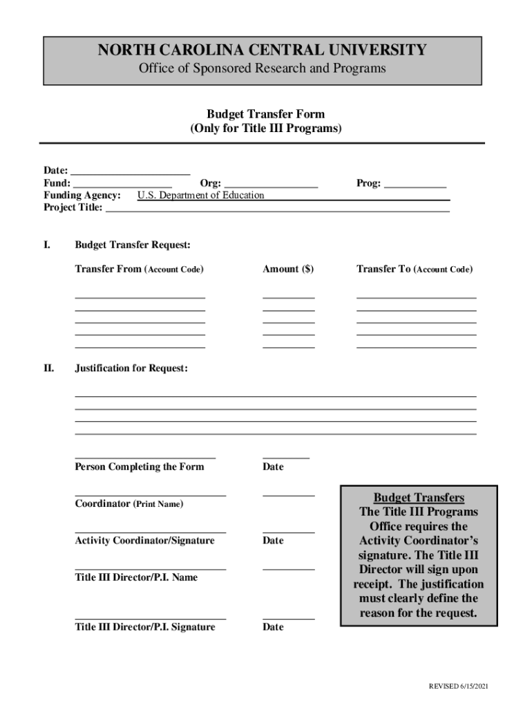 NORTH CAROLINA CENTRAL UNIVERSITY Office of Sponsored Research and Programs Budget Transfer Form (Only for Title III Programs) Date: ___ Fund: ___ Org: ___ Pro: ___ Funding Agency: U.S. Department