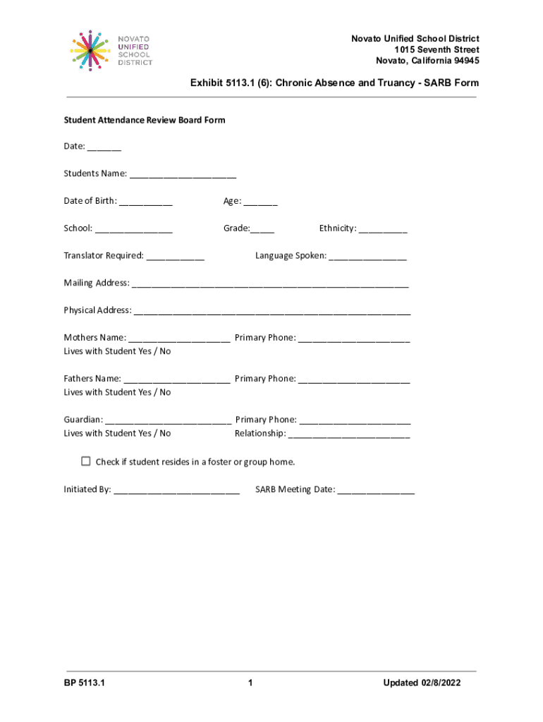 Novato Unified School District 1015 Seventh Street Novato, California 94945Exhibit 5113.1 (6): Chronic Absence and Truancy SARA FormStudent Attendance Review Board Form Date: ___ Students Name: ___
