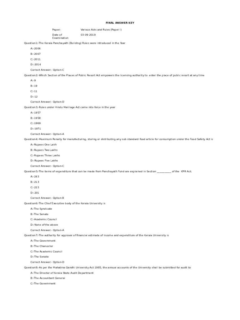 FINAL ANSWER KEY Paper:Various Acts and Rules (Paper I)Date of Examination03092019Question1:The Kerala Panchayath (Building) Rules were introduced in the Year A:2006 B:2007 C:2011 D:2014 Correct Answer: