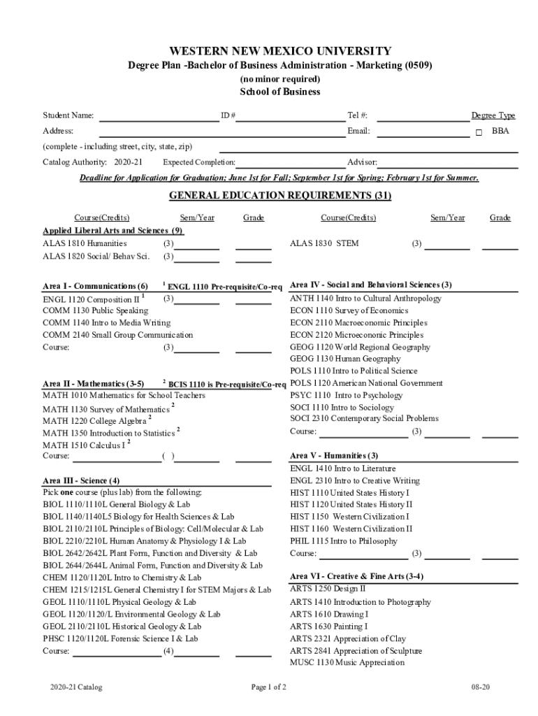 WESTERN NEW MEXICO UNIVERSITYDegree Plan Bachelor of Business Administration Marketing (0509)