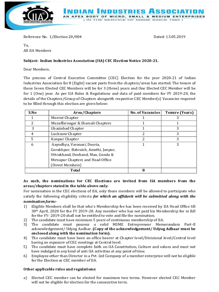 Reference No. 1/Election 20/004Dated: 13.05.2019To, All IIA Members Subject: Indian Industries Association (IIA) CEC Election Notice 202021. Dear Members, The process of Central Executive Committee