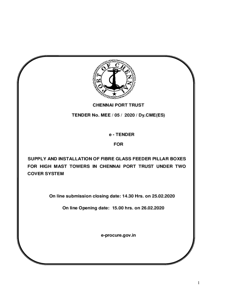 CHENNAI PORT TRUST TENDER No. ME / 05 / 2020 / Dy.CME(ES)e TENDER FOR SUPPLY AND INSTALLATION OF Fiber GLASS FEEDER PILLAR BOXES FOR HIGH MAST TOWERS IN CHENNAI PORT TRUST UNDER TWO COVER System line