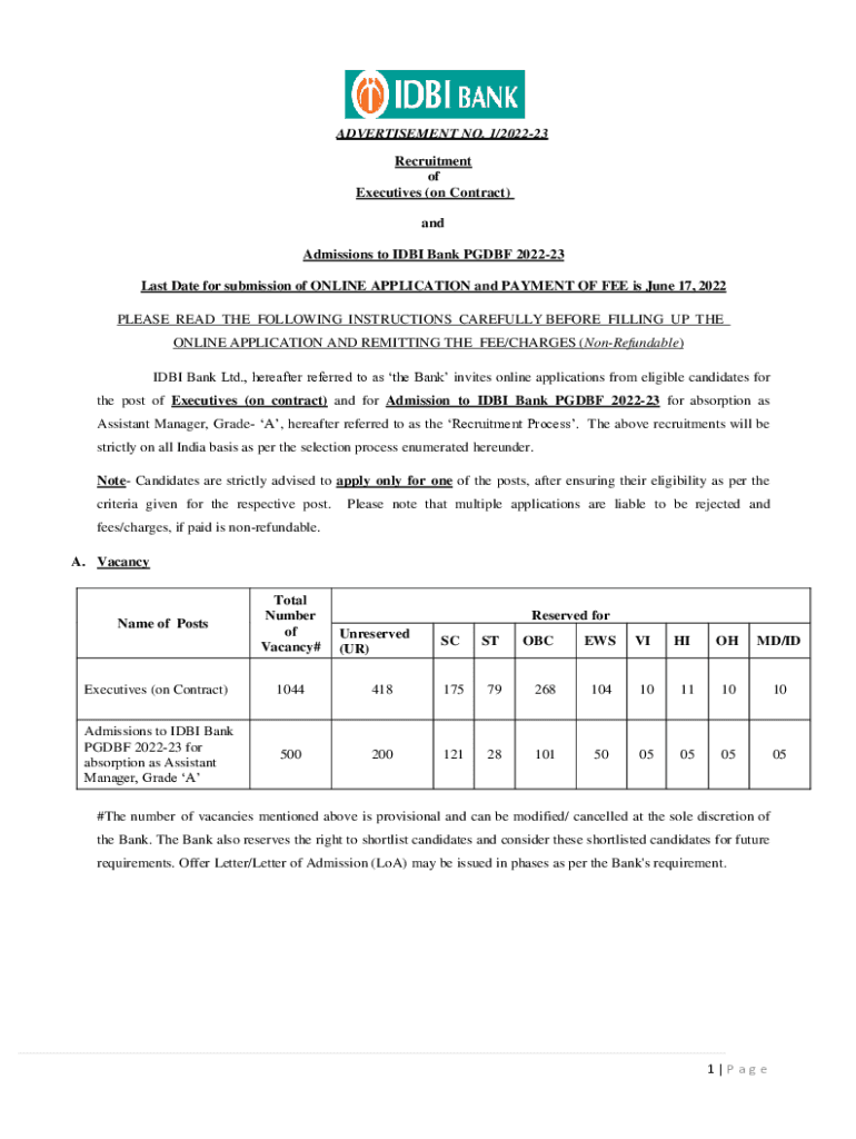 ADVERTISEMENT NO. 1/202223 Recruitment of Executives (on Contract) and Admissions to IDB Bank PG DBF 202223 Last Date for submission of ONLINE APPLICATION and PAYMENT OF FEE is June 17, 2022, PLEASE