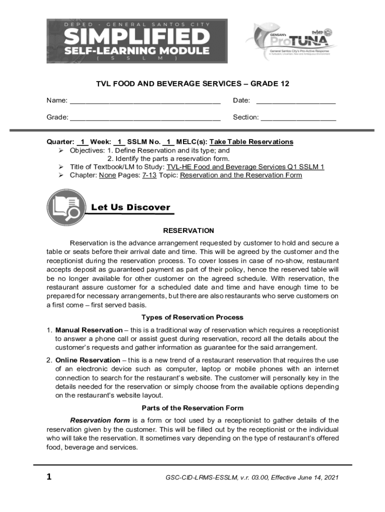 TV FOOD AND BEVERAGE SERVICES GRADE 12 Name: ___Date: ___Grade: ___Section: ___Quarter: 1 Week: 1 SSL No. 1 MELT(s): Take Table Reservations Objectives: 1. Define Reservation and its type; and 2.