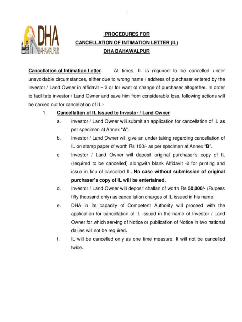 1PROCEDURES FOR CANCELLATION OF INTIMATION LETTER (IL) DHA BAHAWALPURCancellation of Intimation Letter. At times, IL is required to be cancelled under unavoidable circumstances, either due to wrong