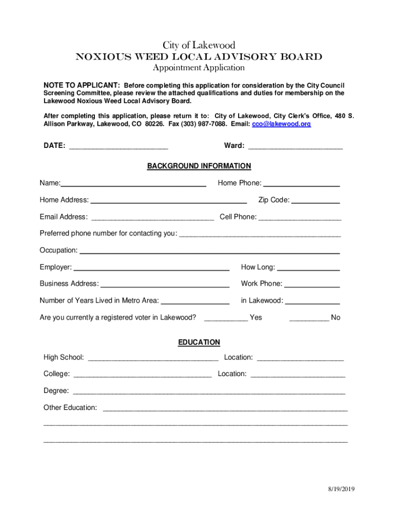 City of Lakewood Noxious Weed LOCAL advisory board Appointment Application NOTE TO APPLICANT: Before completing this application for consideration by the City Council Screening Committee, please review