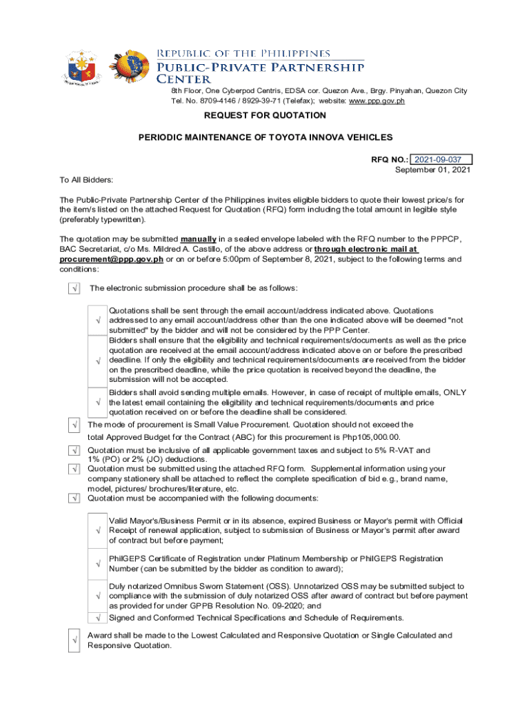 Tel. No. 87094146 / 89293971 (Telefax); website: www.ppp.gov.phREQUEST FOR QUOTATION