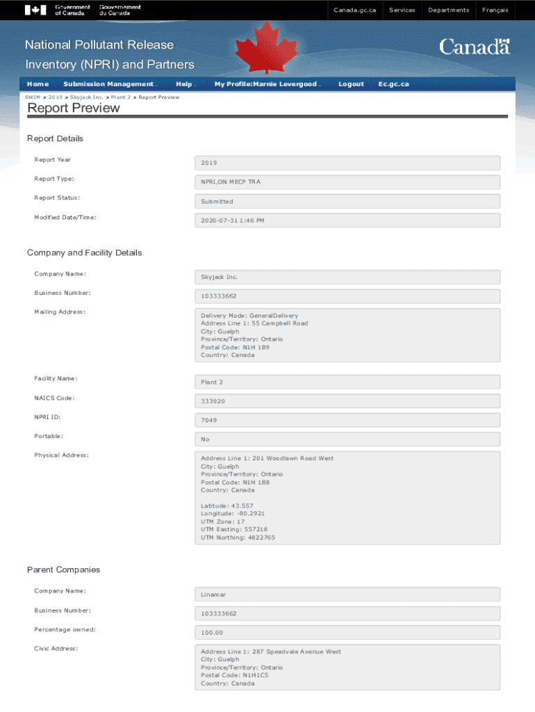 Canada.GC.caServicesNational Pollutant Release Inventory (NPR) and Partners Home SWIMSubmission Management2019Skyjack Inc. Plant 2HelpMy Profile:Marine LevergoodLogoutReport PreviewReport Preview