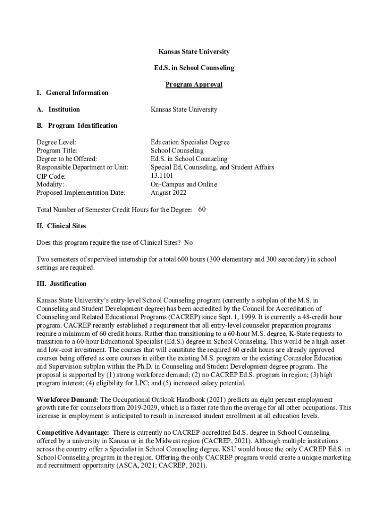 Kansas State University Ed. S. in School Counseling I. General Information A. InstitutionProgram Approval Kansas State University. Program Identification Degree Level: Program Title: Degree to be