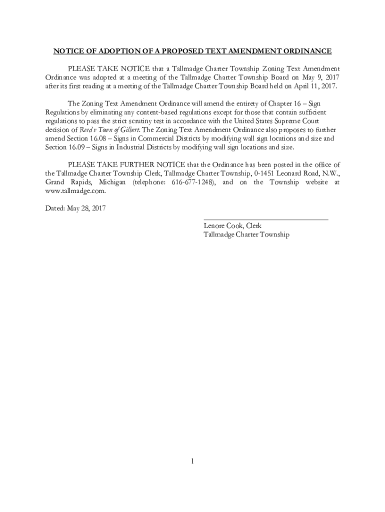 NOTICE OF ADOPTION OF A PROPOSED TEXT AMENDMENT ORDINANCE PLEASE TAKE NOTICE that a Talmadge Charter Township Zoning Text Amendment Ordinance was adopted at a meeting of the Talmadge Charter Township