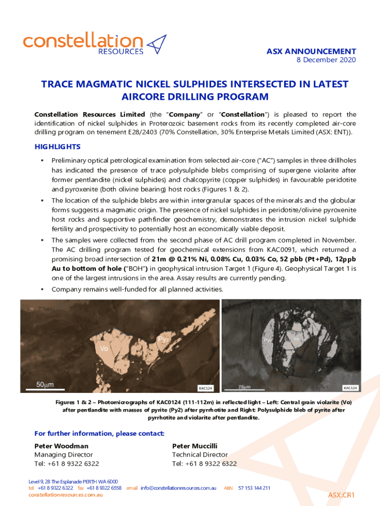 ASX ANNOUNCEMENT8 December 2020TRACE MAGMATIC NICKEL SULPHIDES INTERSECTED IN The LATEST AIRPORT DRILLING PROGRAM Constellation Resources Limited (the Company or Constellation) is pleased to report