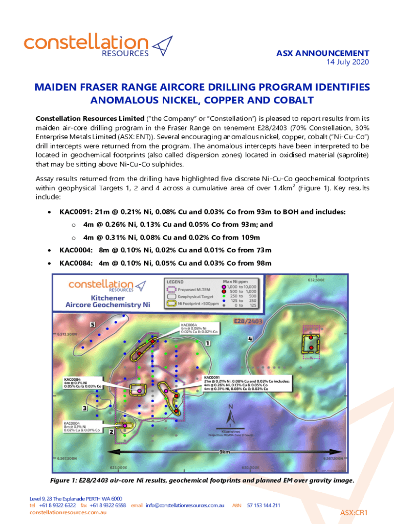 ASX ANNOUNCEMENT14 July 2020MAIDEN FRASER RANGE AIRPORT DRILLING PROGRAM IDENTIFIES ANOMALOUS NICKEL, COPPER AND COBALT Constellation Resources Limited (the Company or Constellation) is pleased to
