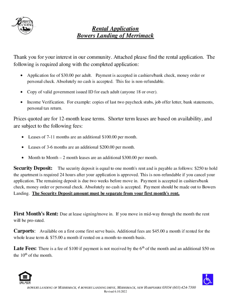 Rental Application Bowers Landing of MerrimackThank you for your interest in our community. Attached please find the rental application. The following is required along with the completed application: