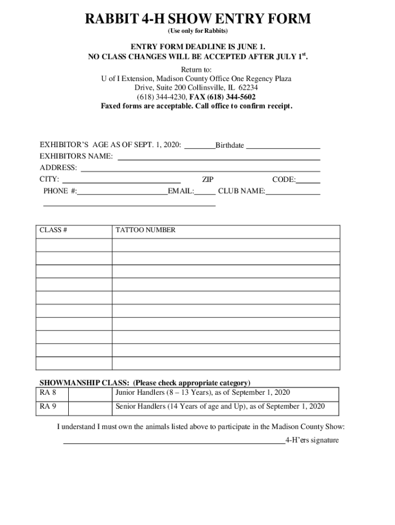 Get the free RABBIT 4-H SHOW ENTRY FORM - extension illinois
