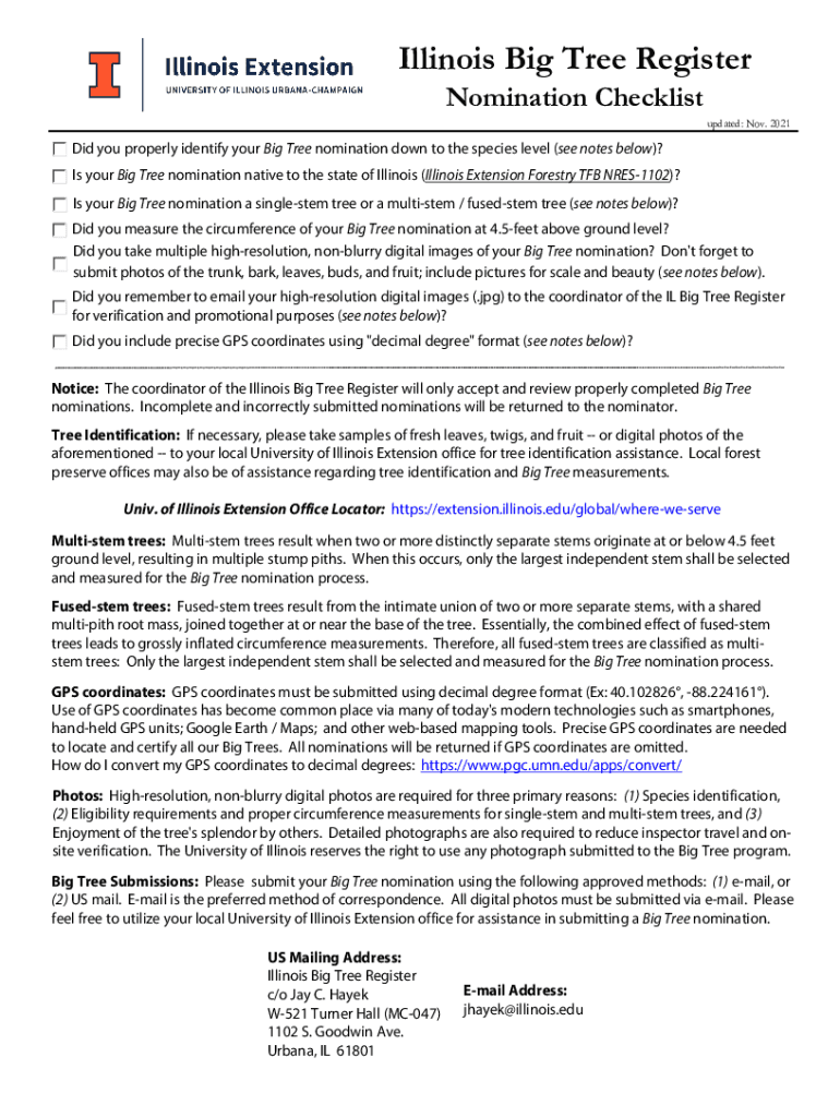 Illinois Big Tree Register Nomination Checklist updated: Nov. 2021Did you properly identify your Big Tree nomination down to the species level (see notes below)? Is your Big Tree nomination native