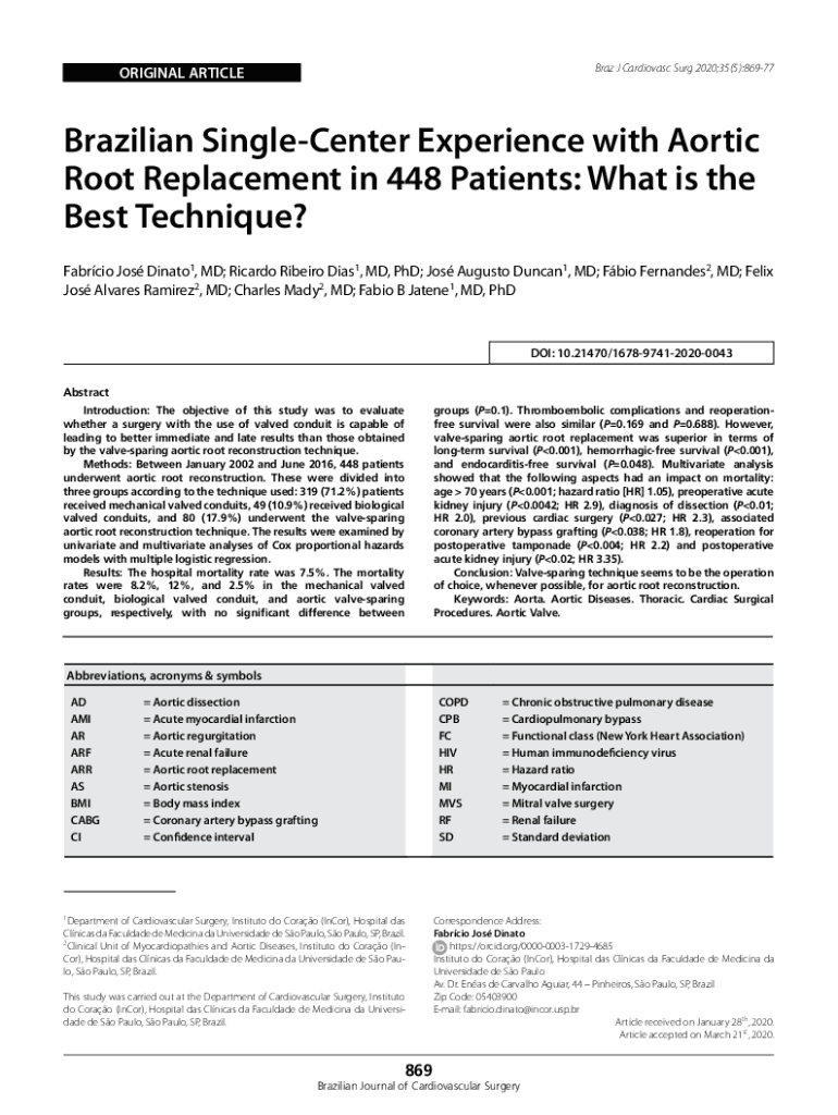 Brad J Cardiac Sure 2020;35(5):86977ORIGINAL ARTICLE Brazilian Single-ended Experience with Aortic Root Replacement in 448 Patients: What is the Best Technique? Fabricio Jo's Dinato1, MD; Ricardo