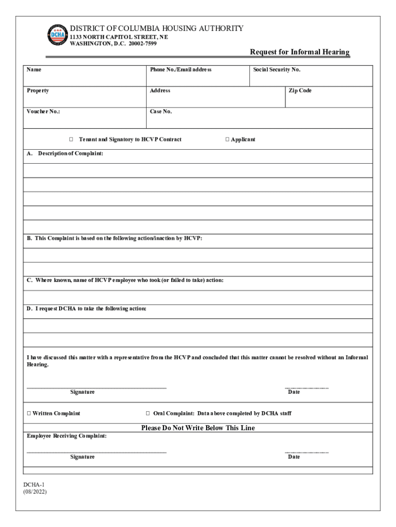 DISTRICT OF COLUMBIA HOUSING AUTHORITY OFFICE OF FAIR HEARINGS HOUSING CHOICE VOUCHER PROGRAM HEARING REQUEST (QUICK GUIDE) A. The Office of Fair Hearings (OF) is responsible for ensuring those grievances