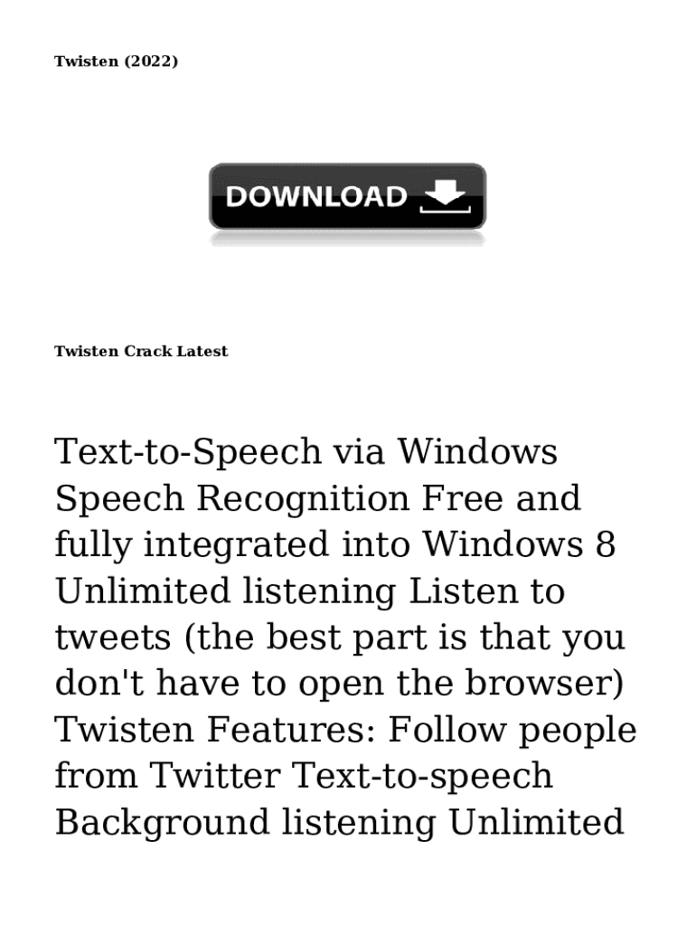 Twisted (2022)Twisted Crack LatestTexttoSpeech via Windows Speech Recognition Free and fully integrated into Windows 8 Unlimited listening Listen to tweets (the best part is that you don\'t have to