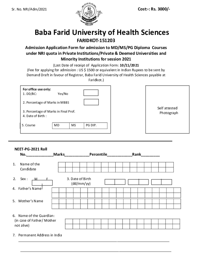 Cost:: Rs. 3000/Sr. No. NRI/Adm/2021Baba Farid University of Health Sciences FARIDKOT151203 Admission Application Form for admission to MD/MS/PG Diploma Courses under NRI quota in Private Institutions/Private