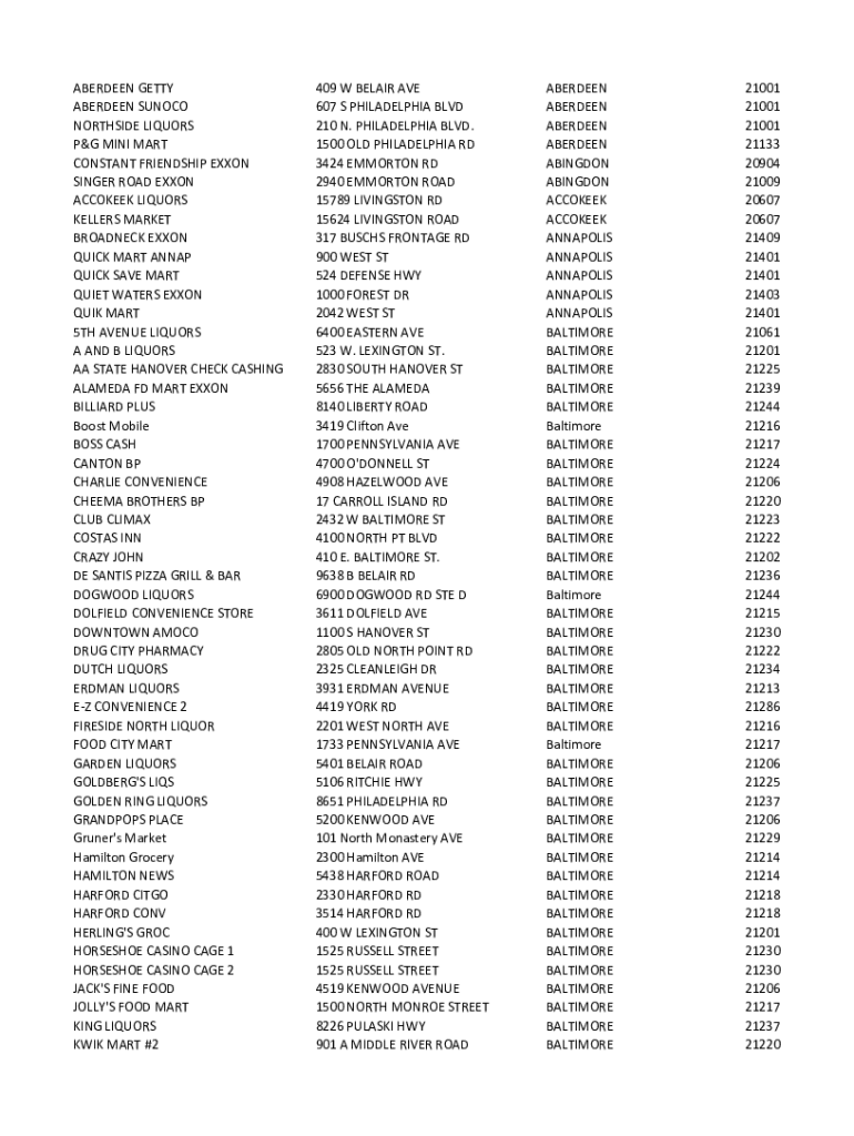 ABERDEEN GETTY ABERDEEN SUN OCO NORTHSIDE LIQUORS P&G MINI MART CONSTANT FRIENDSHIP EXXON SINGER ROAD EXXON ACCORDED LIQUORS SELLERS MARKET BREAKNECK EXXON QUICK MART ANNA QUICK SAVE MART QUIET WATERS