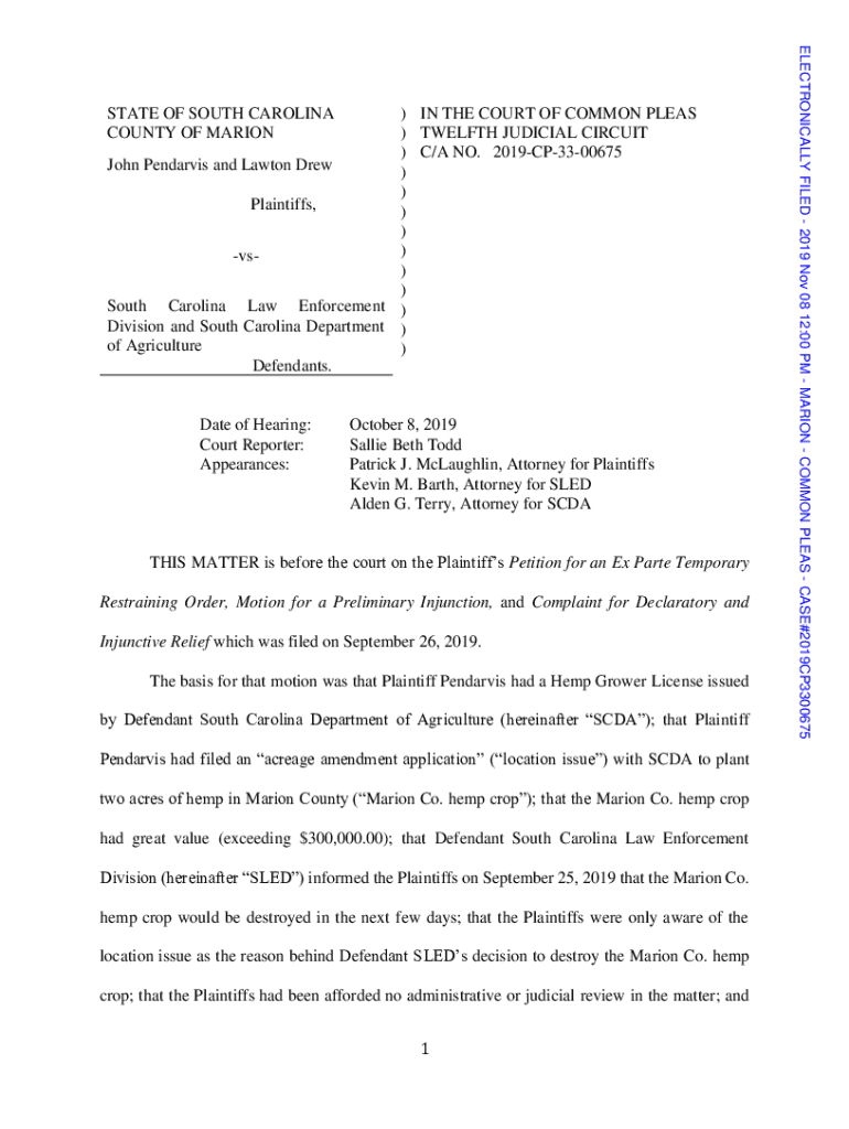 ) IN THE COURT OF COMMON PLEAS) TWELFTH JUDICIAL CIRCUIT) C/A NO. 2019CP3300675 John Gendarmes and Lawton Drew)) Plaintiffs, ) )) vs)) South Carolina Law Enforcement) Division and South Carolina Department)