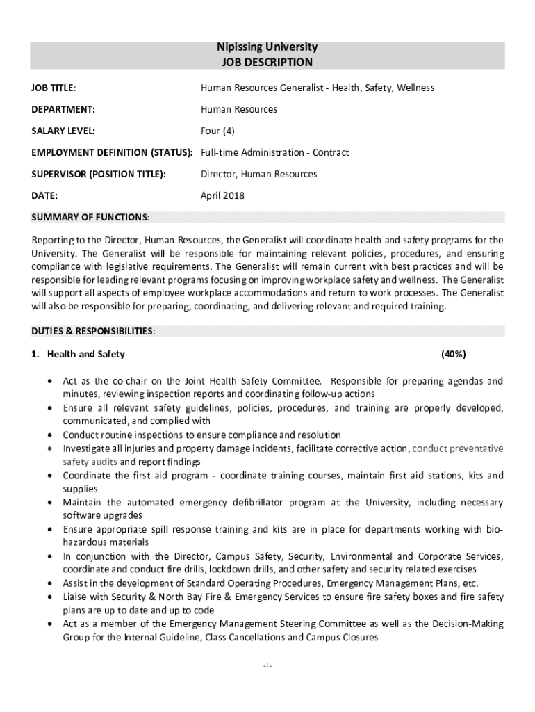 Ni pissing University JOB DESCRIPTION JOB TITLE:Human Resources Generalist Health, Safety, WellnessDEPARTMENT:Human ResourcesSALARY LEVEL:Four (4)EMPLOYMENT DEFINITION (STATUS): Full time Administration