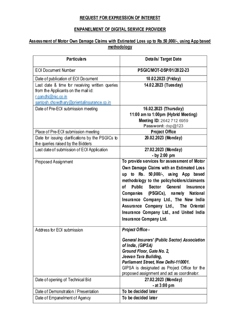 REQUEST FOR EXPRESSION OF INTEREST ENGAGEMENT OF DIGITAL SERVICE PROVIDER Assessment of Motor Own Damage Claims with Estimated Loss up to Rs.50,000/, using App based methodology Particulars EOI Document