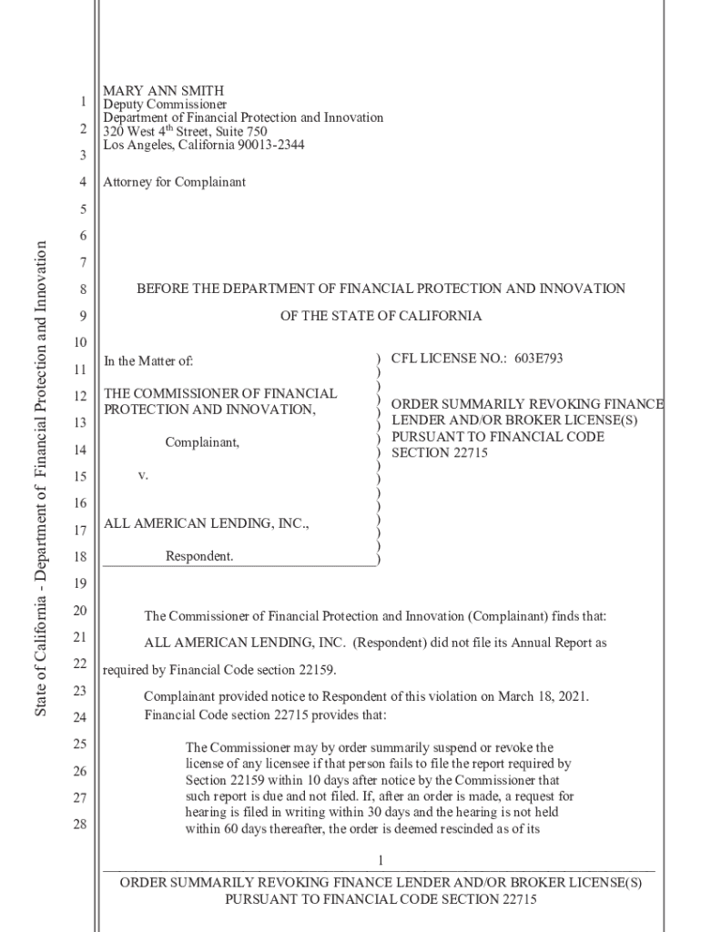 1 2 3 4MARY ANN SMITH Deputy Commissioner Department of Financial Protection and Innovation 320 West 4th Street, Suite 750 Los Angeles, California 900132344 Attorney for ComplainantState of California