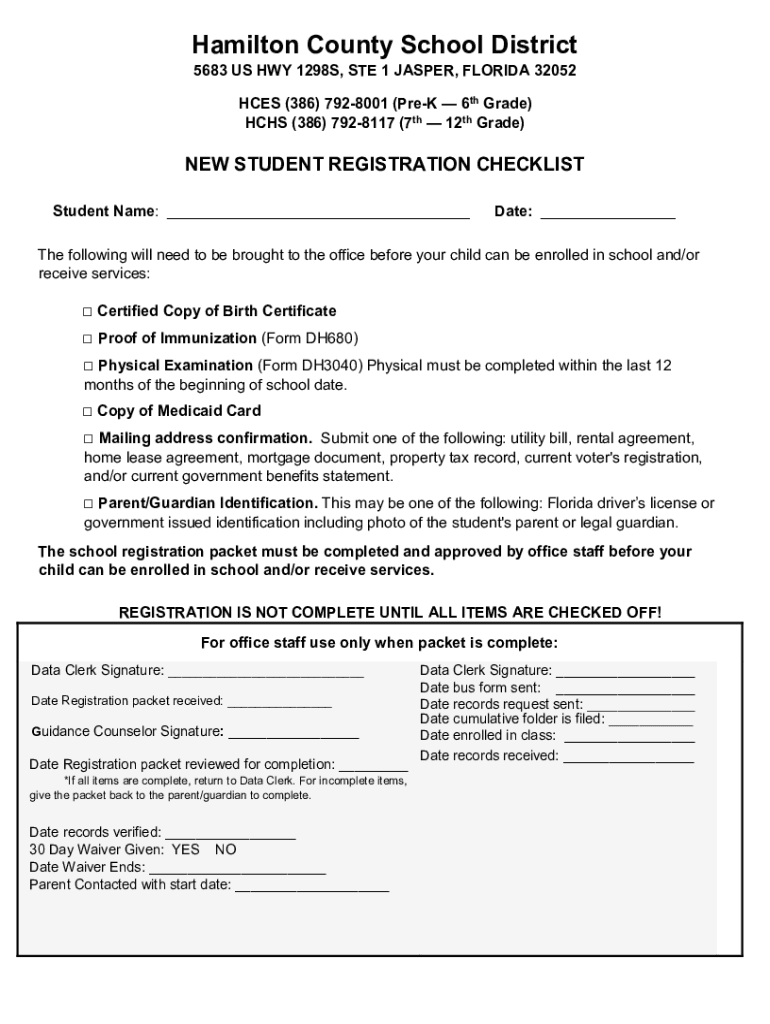 Hamilton County School District 5683 US HWY 1298S, STE 1 JASPER, FLORIDA 32052 ACES (386) 7928001 (Prey 6th Grade) HHS (386) 7928117 (7th 12th Grade)NEW STUDENT REGISTRATION CHECKLIST Student Name: