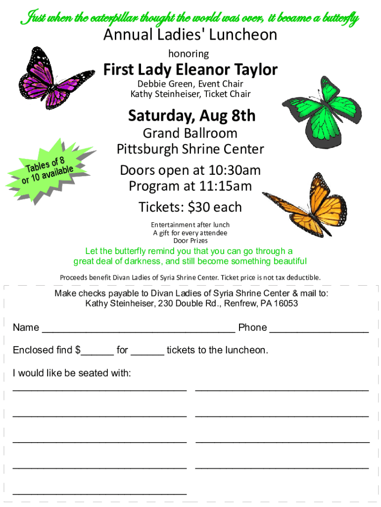 Just when the caterpillar thought the world was over, it became a butterfly Annual Ladies\' Luncheon honoringFirst Lady Eleanor Taylor Debbie Green, Event Chair Kathy Sennheiser, Ticket Chair Saturday,