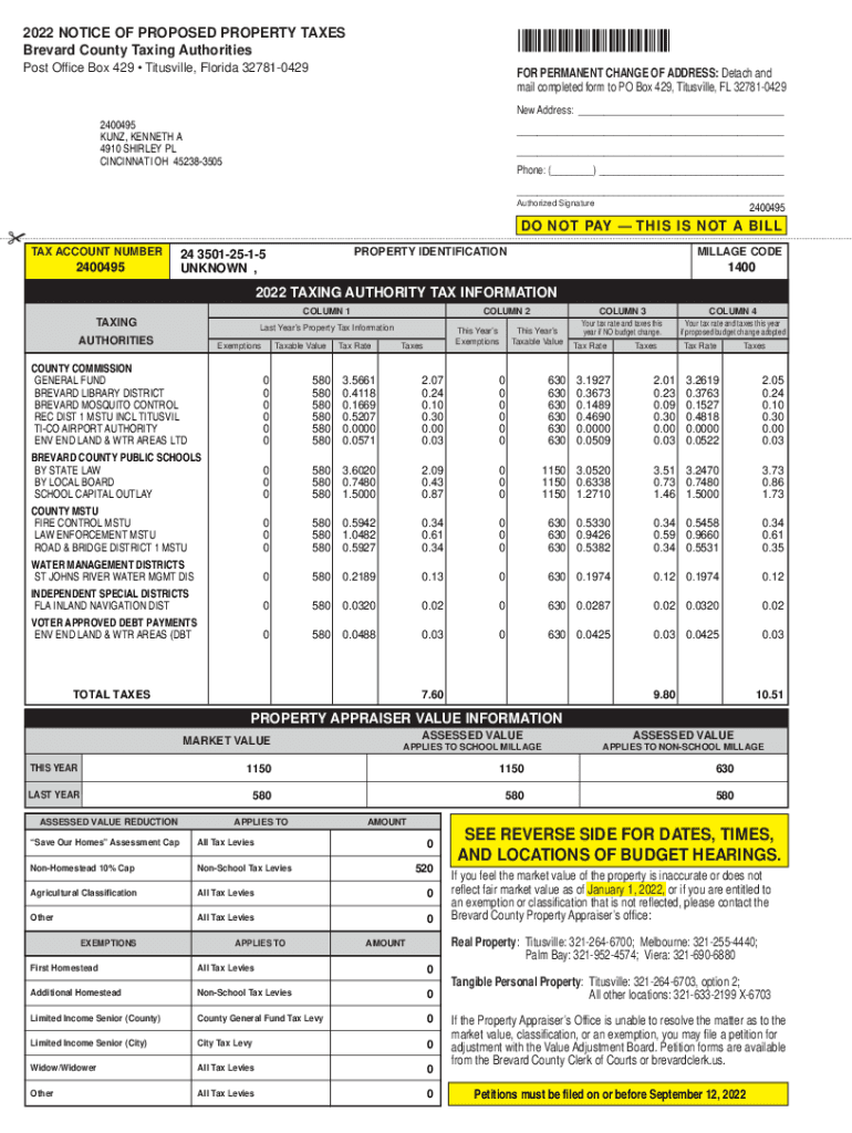 *2400495×2022 NOTICE OF PROPOSED PROPERTY TAXES Brevard County Taxing Authorities Post Office Box 429 Titusville, Florida 327810429FOR PERMANENT CHANGE OF ADDRESS: Detach and mail completed form