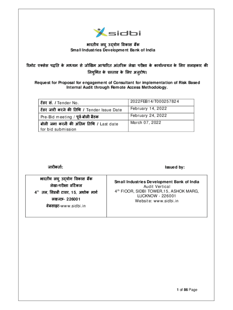 Small Industries Development Bank of India Request for Proposal for engagement of Consultant for implementation of Risk Based Internal Audit through Remote Access Methodology.