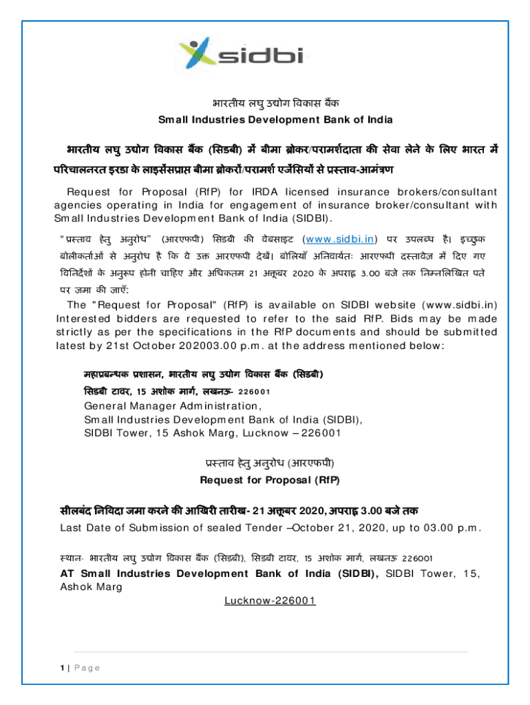 Small Industries Development Bank of India () / / Request for Proposal (RFP) for IRA licensed