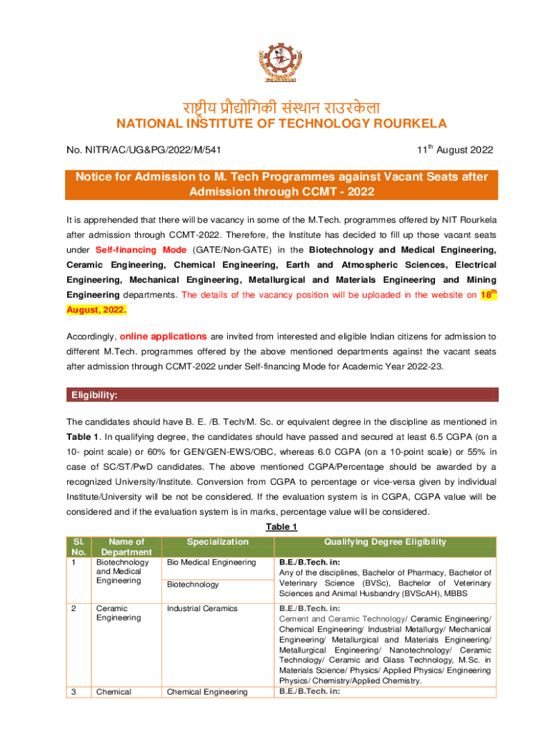 NATIONAL INSTITUTE OF TECHNOLOGY ROURKELA 11th August 2022No. NIR/AC/GPG/2022/M/541Notice for Admission to M. Tech Programs against Vacant Seats after Admission through CAMT 2022 It is apprehended