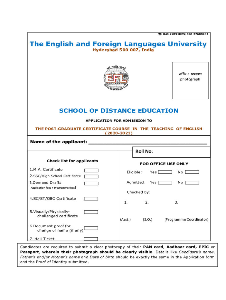 040 27095025; 040 27689431The English and Foreign Languages University Hyderabad 500 007, IndiaAffix a recent photographSCHOOL OF DISTANCE EDUCATION APPLICATION FOR ADMISSION TITHE POSTGRADUATE CERTIFICATE