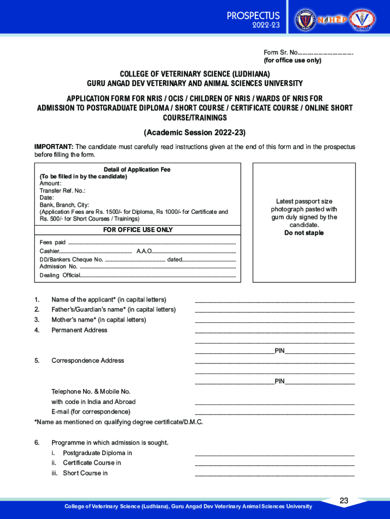 PROSPECTUS202223Form Sr. No...................................(for office use only)COLLEGE OF VETERINARY SCIENCE (LUDHIANA) GURU AN GAD DEV VETERINARY AND ANIMAL SCIENCES UNIVERSITY APPLICATION FORM