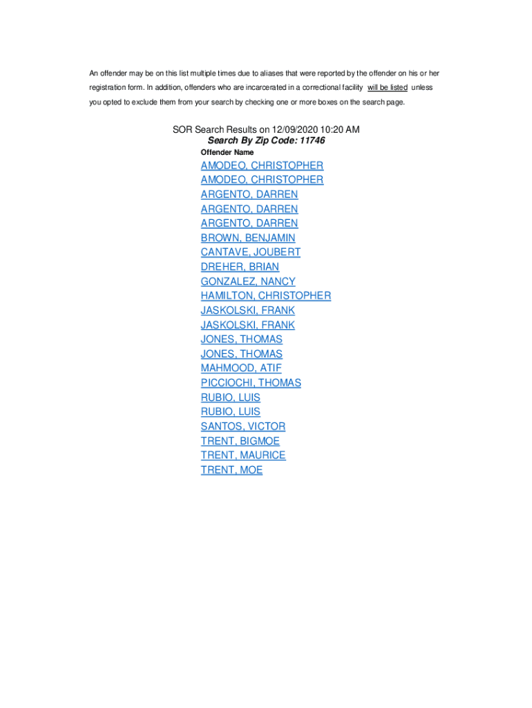 An offender may be on this list multiple times due to aliases that were reported by the offender on his or her registration form. In addition, offenders who are incarcerated in a correctional facility