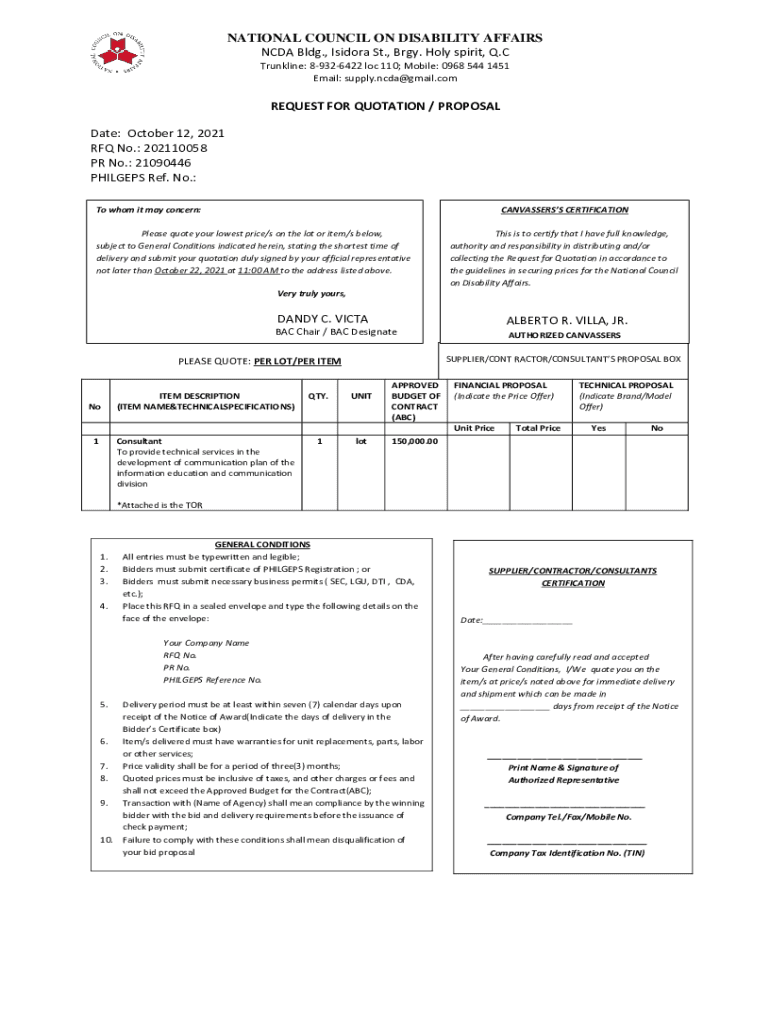 NATIONAL COUNCIL ON DISABILITY AFFAIRS NCAA Bldg., Isidora St., Bray. Holy Spirit, Q. C Trunk line: 89326422 LOC 110; Mobile: 0968 544 1451 Email: supply.ncda@gmail.comREQUEST FOR QUOTATION / PROPOSAL