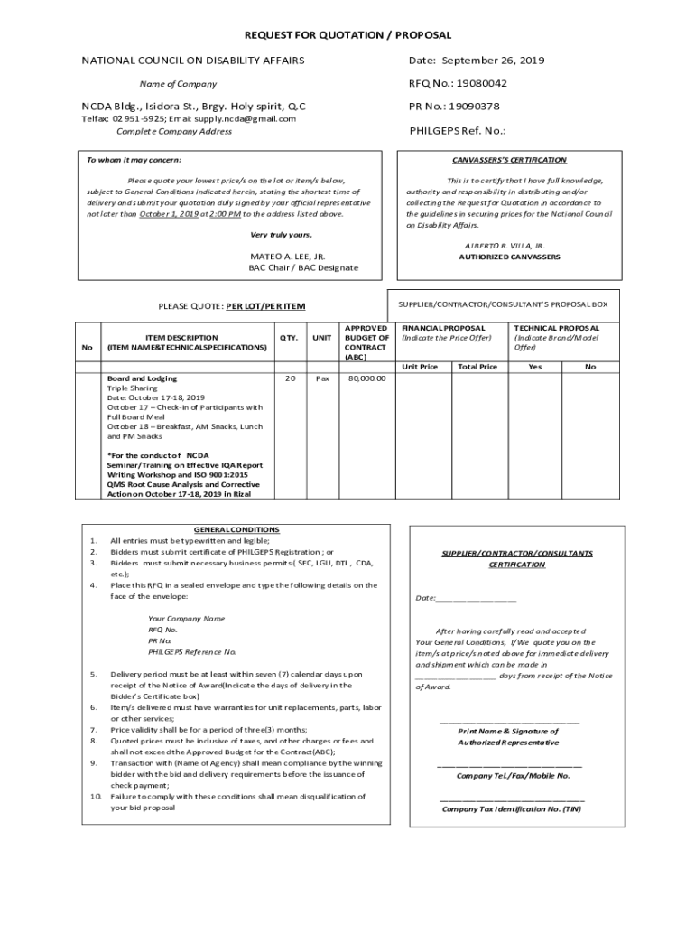RFQ No.: 19080042Name of CompanyNCDA Bldg., Isidora St., Bray. Holy Spirit, Q.CPR No.: 19090378Telfax: