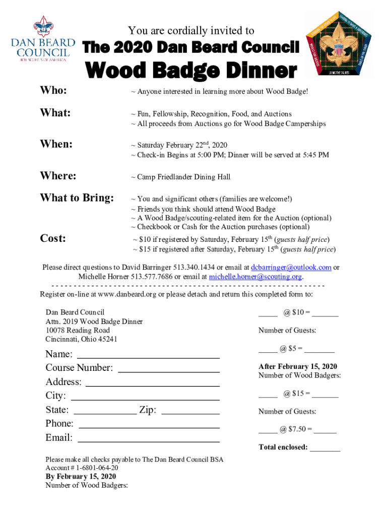 You are cordially invited tithe 2020 Dan Beard Council Who:Wood Badge Dinnerware: When: Where: What to Bring: Cost: Anyone interested in learning more about Wood Badge! Fun, Fellowship, Recognition,