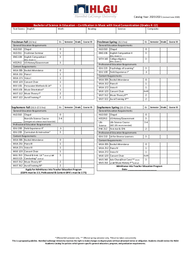 Catalog Year: 20202021 (revised June 2020)Bachelor of Science in Education Certification in Music with Vocal Concentration (Grades K12) Test Scores English:Freshman Fall (16 hrs) General Education